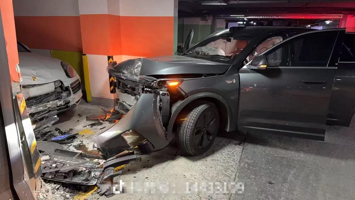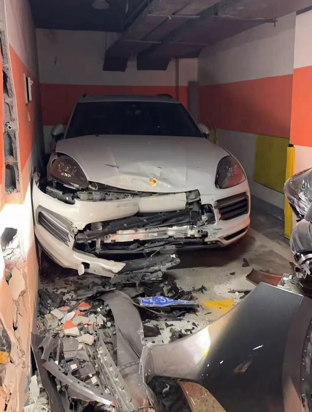 张女士发布照片显示,其保时捷车头凹陷严重,车牌掉落在地,不少配件损坏严重,其保时捷所停的车库也有多处墙面受损。另有一辆理想车停在库门处,车头也一样损毁严重。